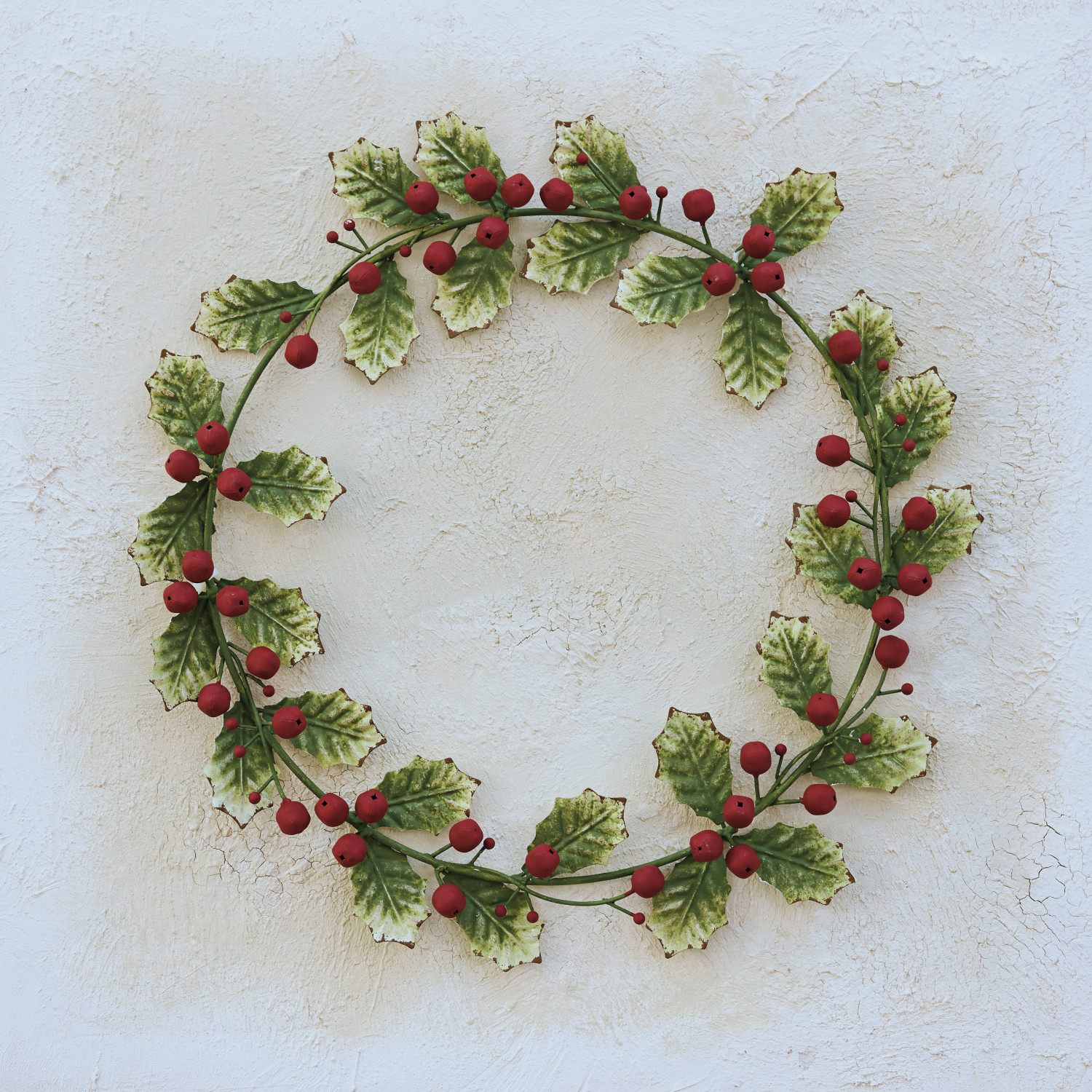 18" Round Metal Holly Wreath with Berries, Green & Red