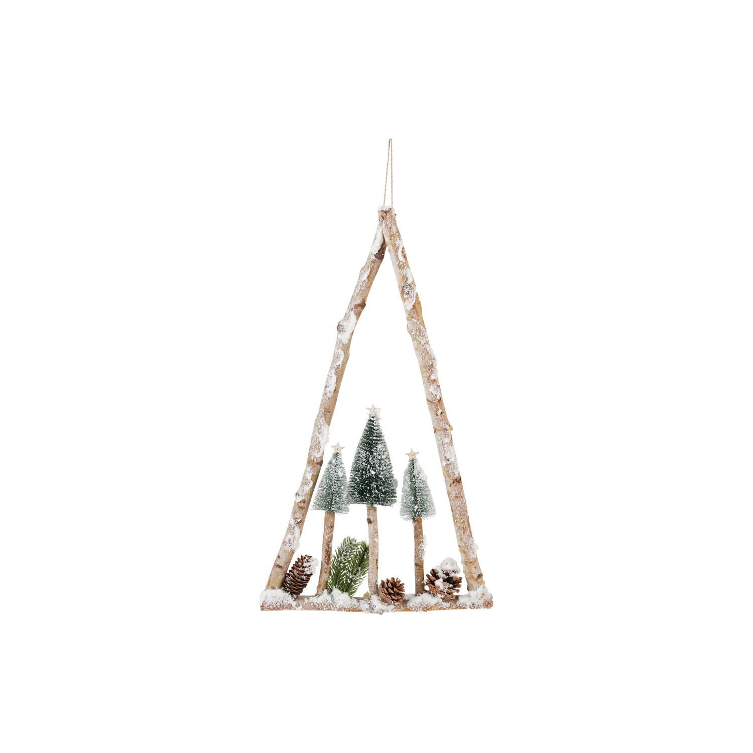 Catalog Name: 13-3/4"W x 21"H Birch Wood Triangle Shaped Wall Décor w/ Bottle Brush Trees, Pinecones & Faux Snow, Natural, Green & White