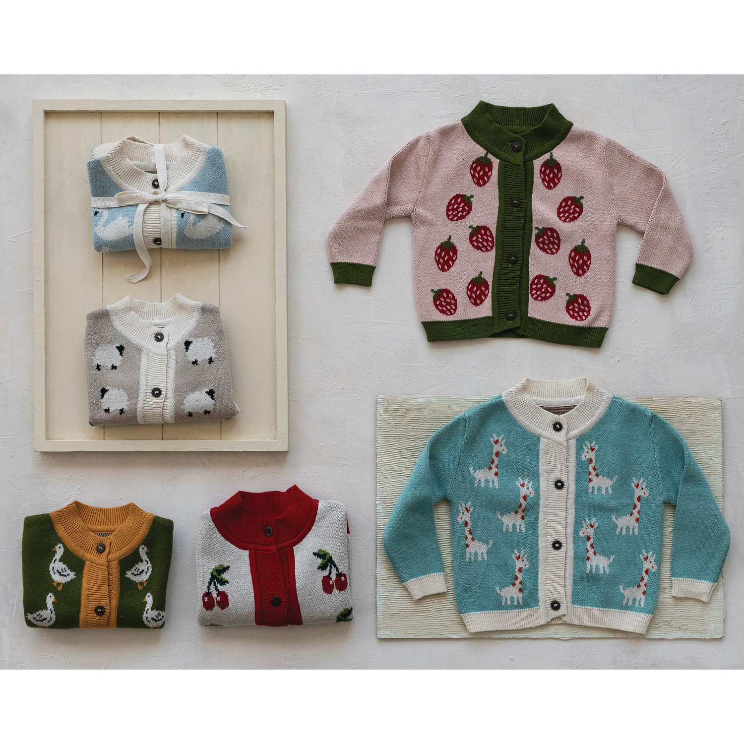 Catalog Name: Cotton Knit Baby Cardigan Sweater w/ Wood Buttons & Giraffes, Multi Color, 3 Sizes, Each Tied w/ Twill Tape (0-3 Months, 3-6 Months, 6-9 Months)