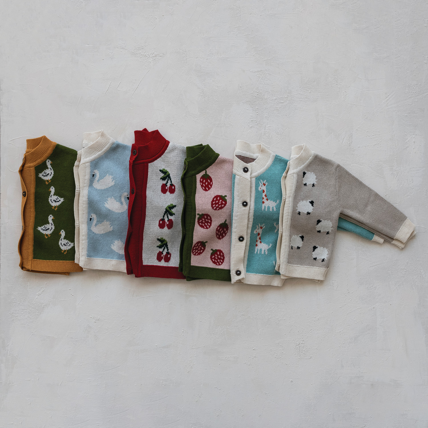 Catalog Name: Cotton Knit Baby Cardigan Sweater w/ Wood Buttons & Cherries, Multi Color, 3 Sizes, Each Tied w/ Twill Tape (0-3 Months, 3-6 Months, 6-9 Months)