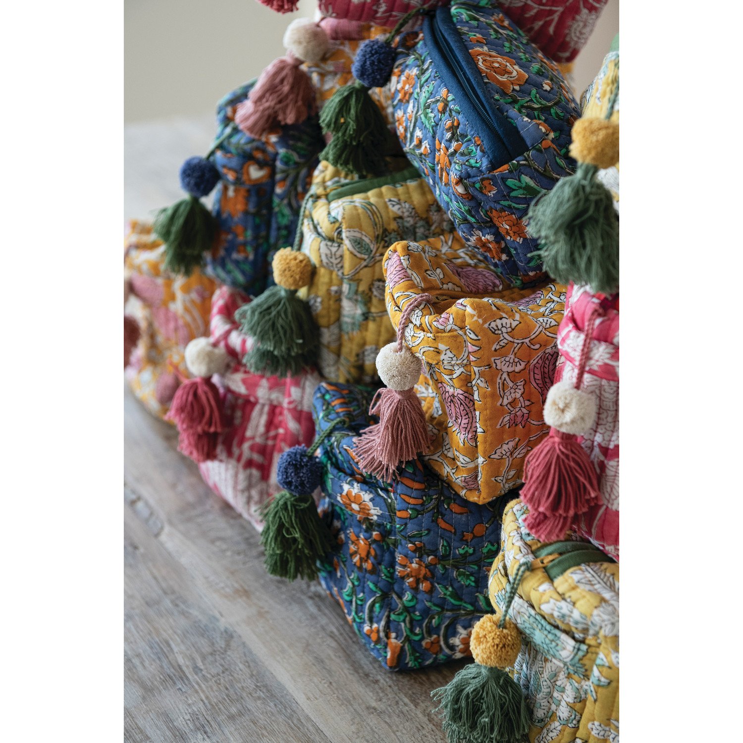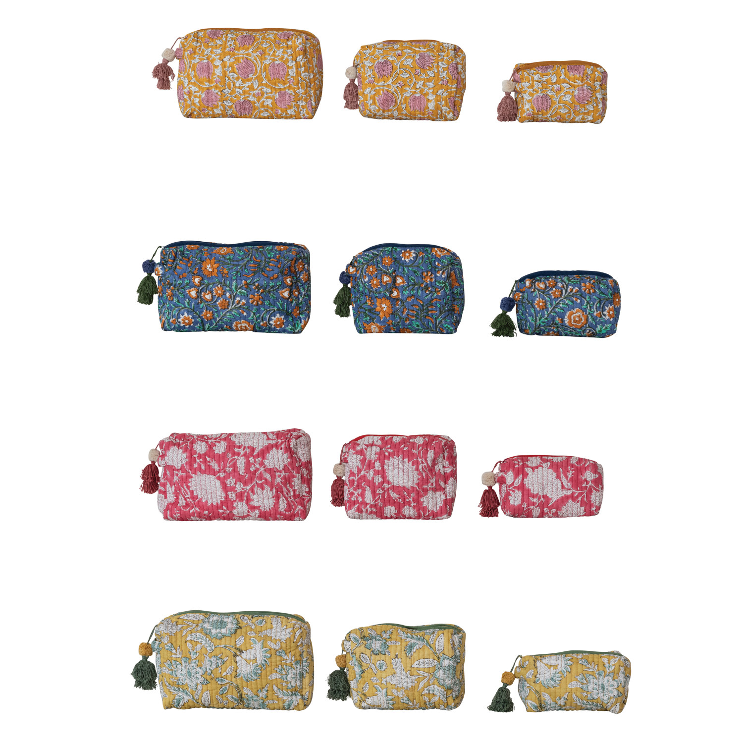 Catalog Name: 6"L - 11"L Quilted Cotton Voile Block Printed Zip Pouches w/ Interior Lining & Floral Pattern, Pom Pom & Tassel, Set of 3, 4 Colors