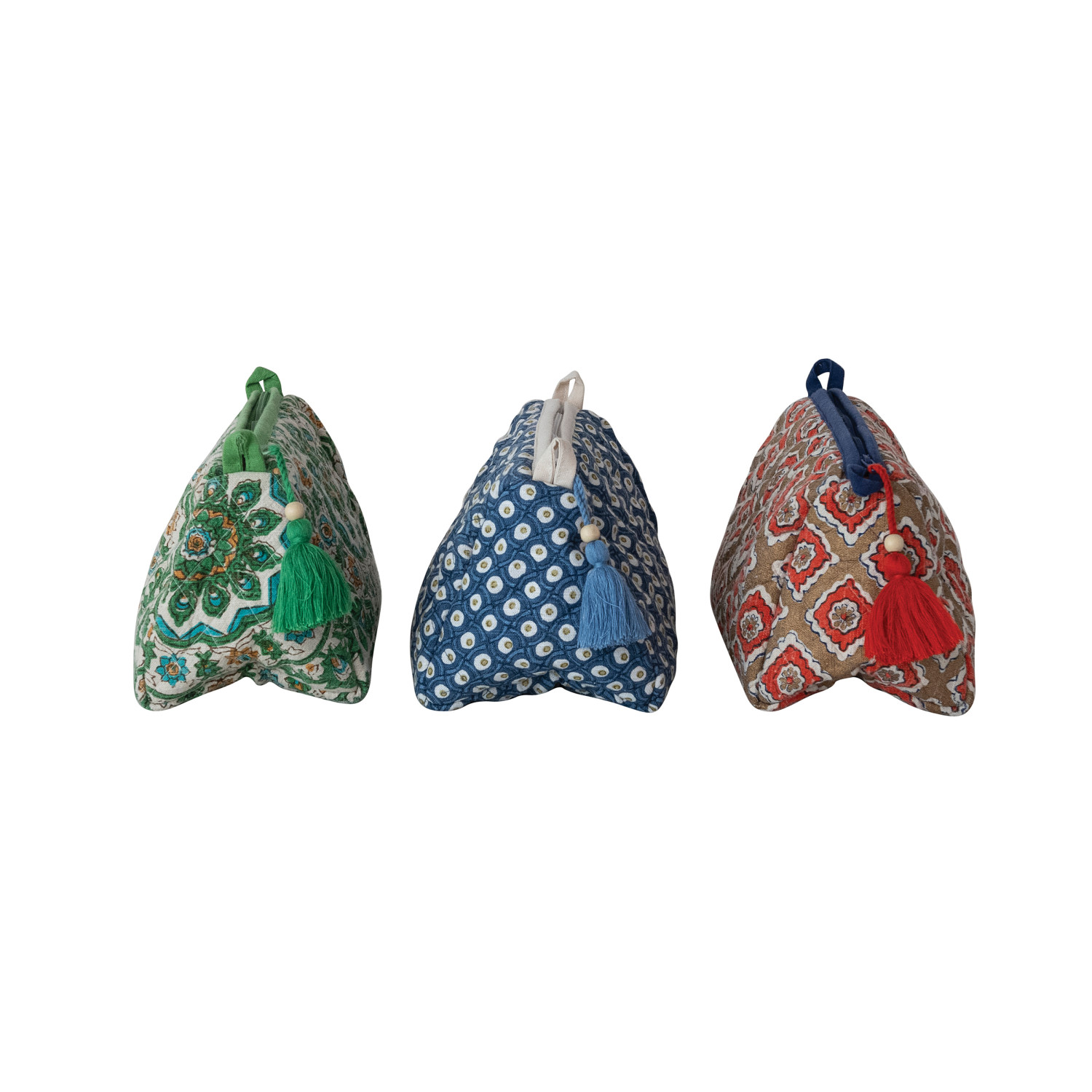 Catalog Name: 9"L x 4-1/2"W x 4-1/2"H Quilted Cotton Slub Printed Zip Pouch w/ Block Print Pattern, Interior Lining, Wood Bead & Tassel, Multi Color, 3 Styles