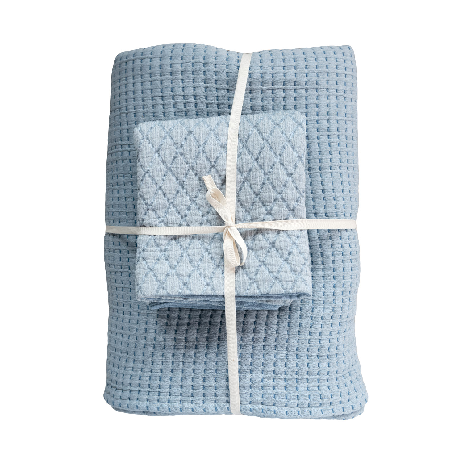 This serene cotton bedding set showcases supple woven cotton jacquard with a kantha stitch, and includes 2 quilted king shams and king-sized bed cover. Blue woven cotton jacquard king bedding set with quilted kantha stitch; Includes 2 king quilted shams and bed cover. Express your constantly evolving style with the simple addition of this eye-catching bedding set. King cotton jacquard bed set; Machine wash cold, gentle cycle, do not bleach, warm iron if needed.
