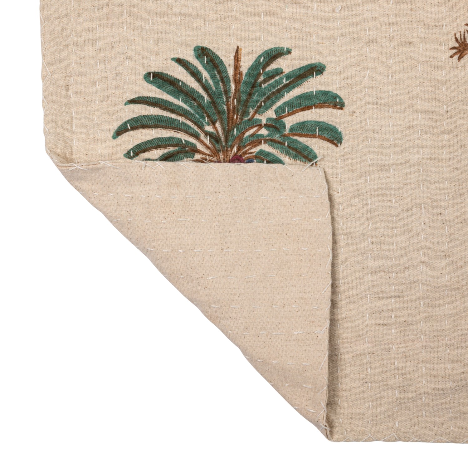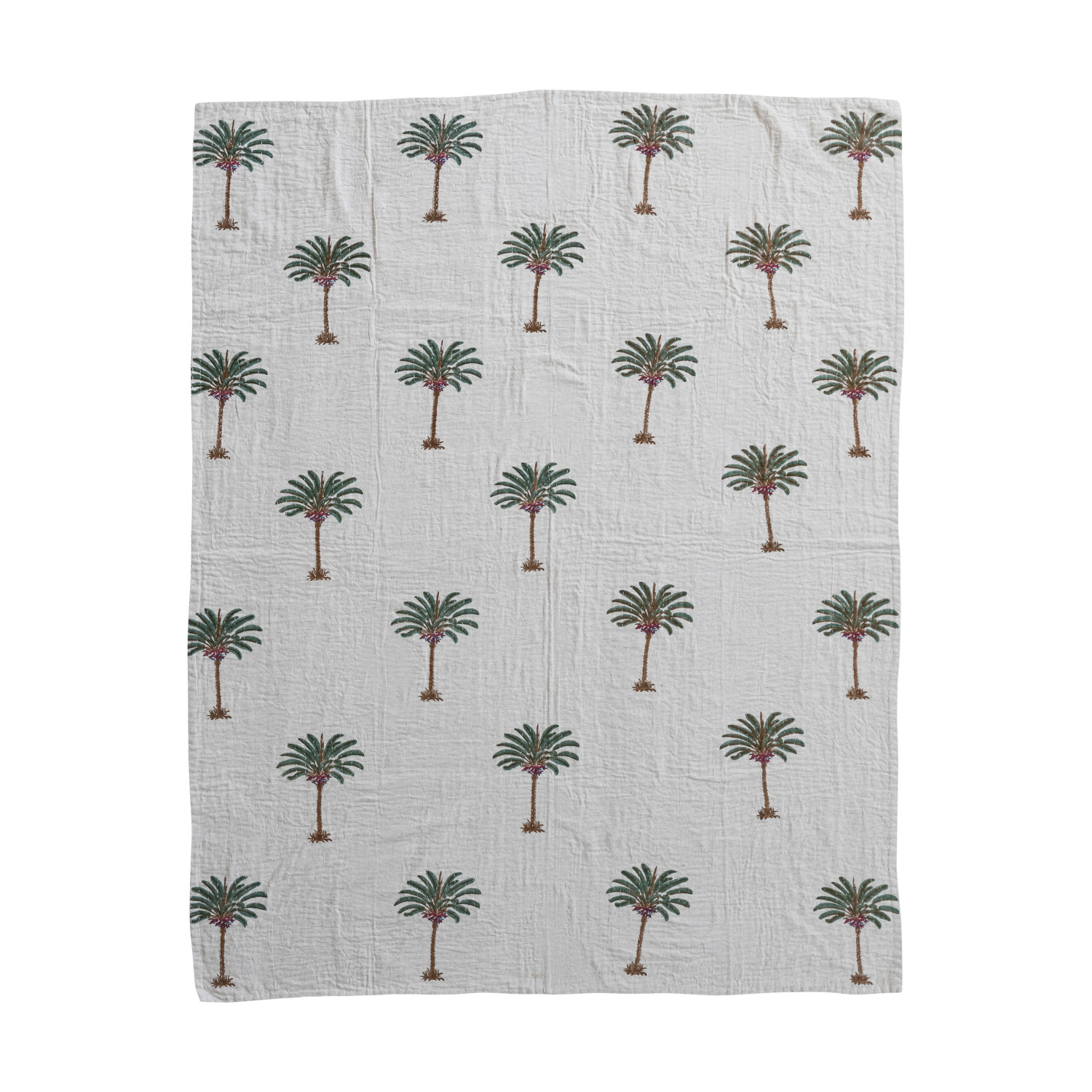 Catalog Name: 60"L x 50"W Cotton & Linen Block Printed Throw w/ Palm Trees & Hand-Embroidered Kantha Stitch, Natural, Green & Brown