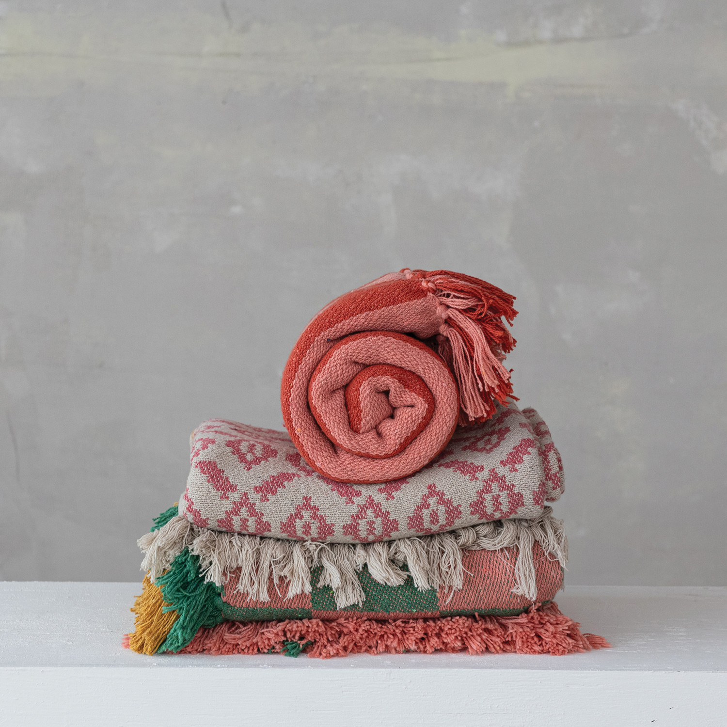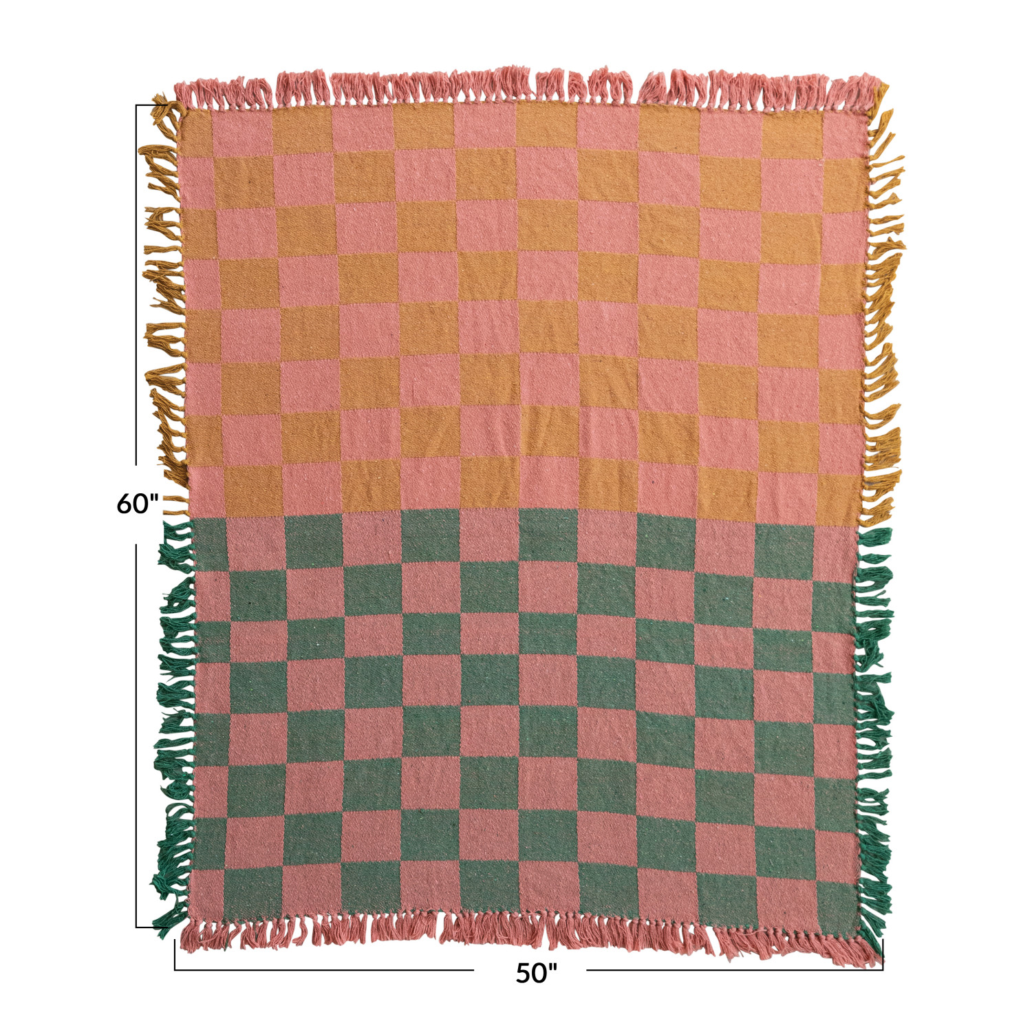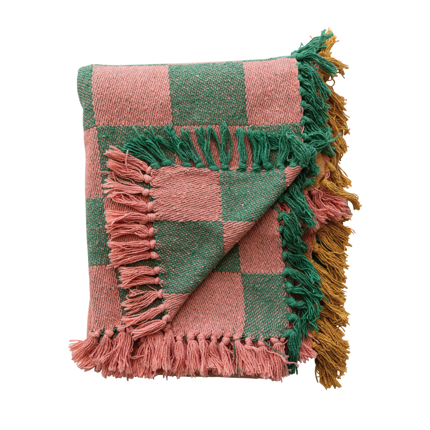 Woven Recycled Cotton Blend Two-Tone Checked Throw with Fringe