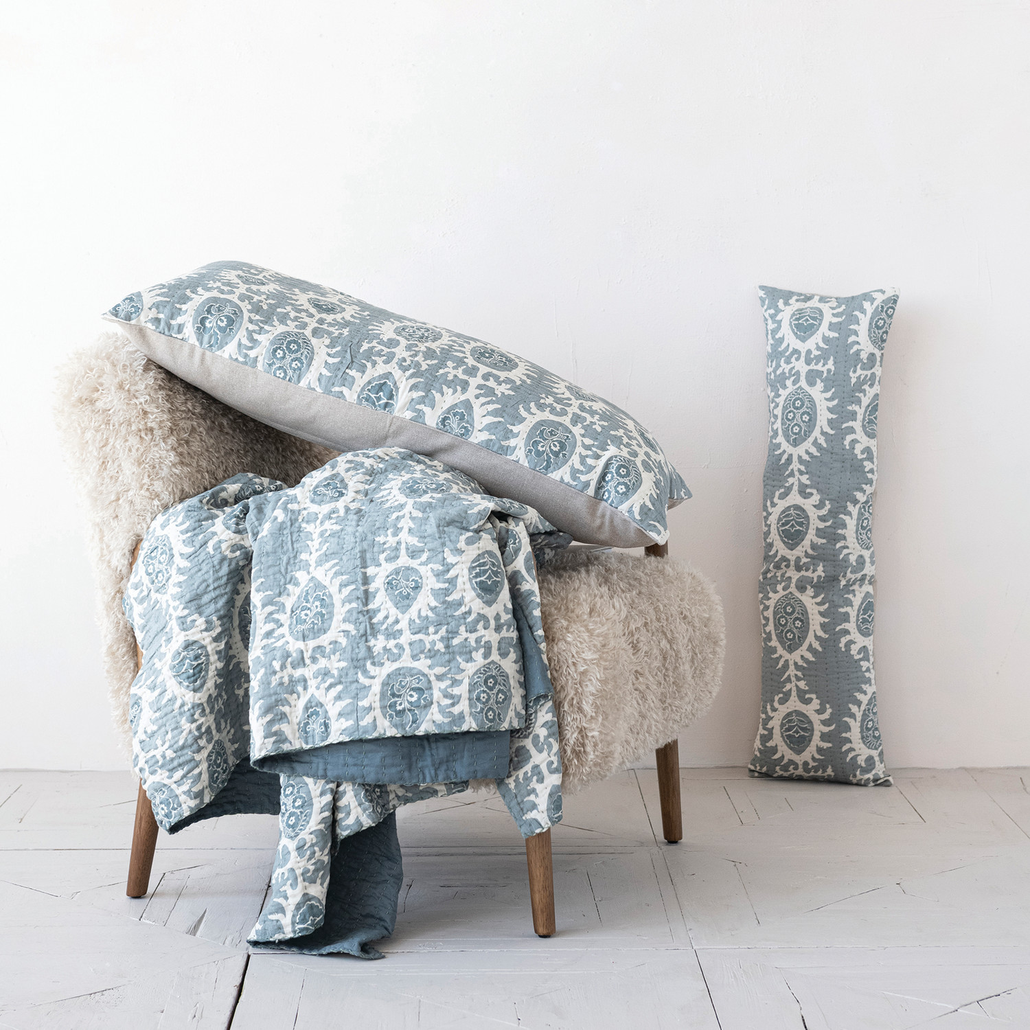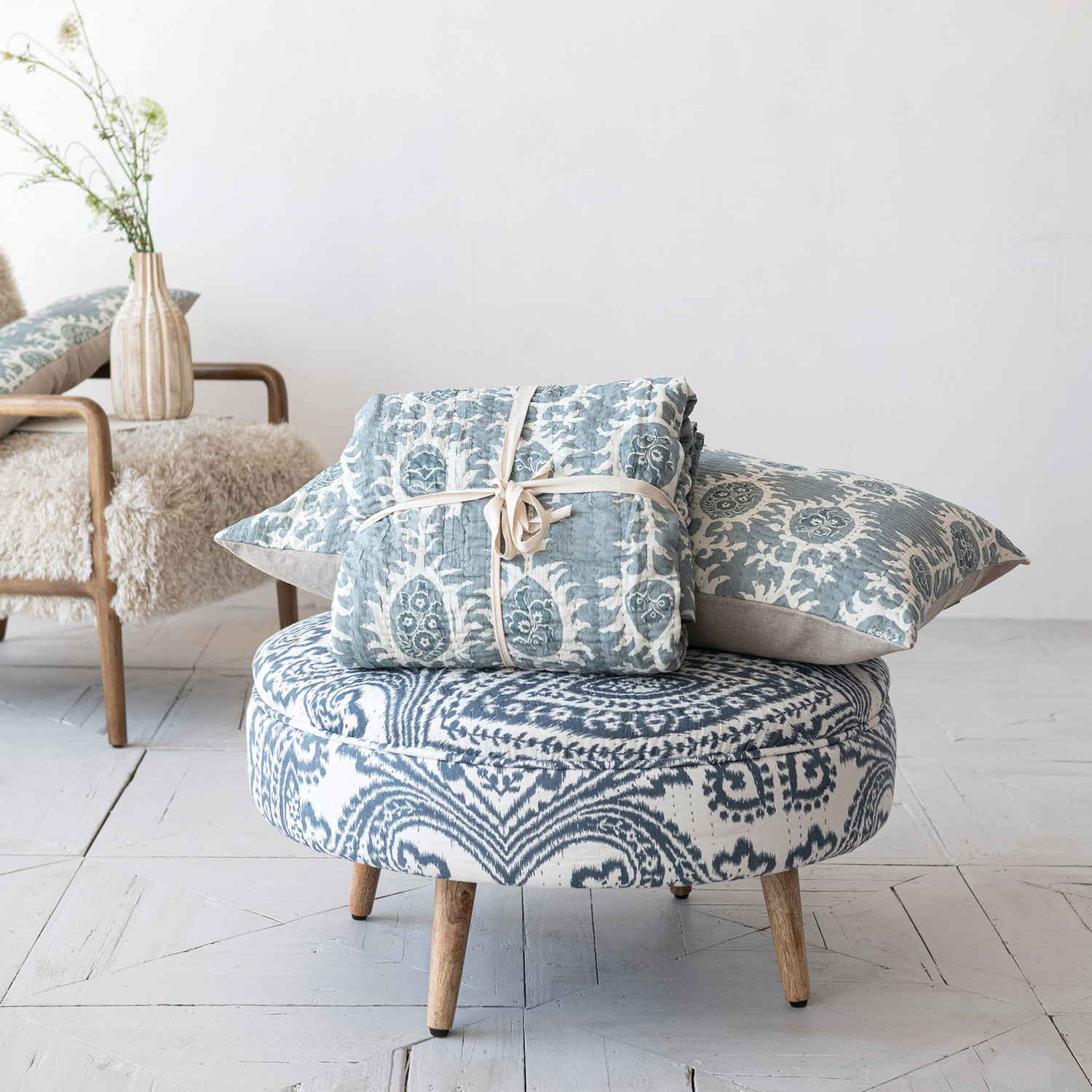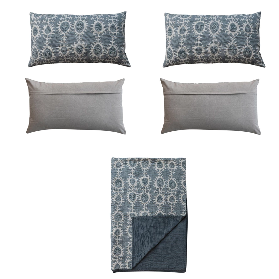 Catalog Name: 118"L x 90"W Cotton Voile Printed Bed Cover w/ Pattern, Hand-Embroidered Kantha Stitch & 2 King Shams, King, Blue & White, Set of 3 Tied w/ Cotton Tape