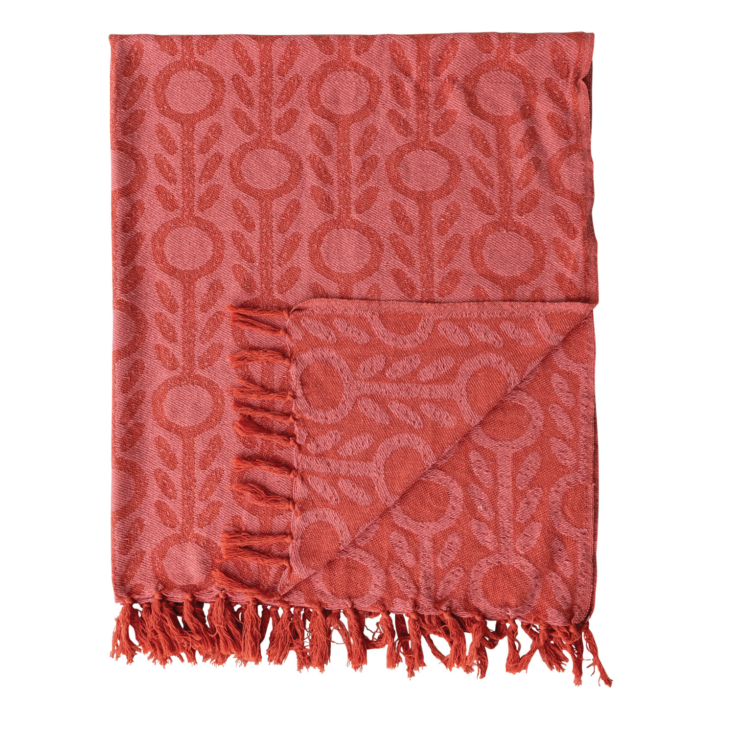 Catalog Name: 60"L x 50"W Woven Recycled Cotton Blend Jacquard Throw w/ Floral Pattern & Fringe, Pink & Red