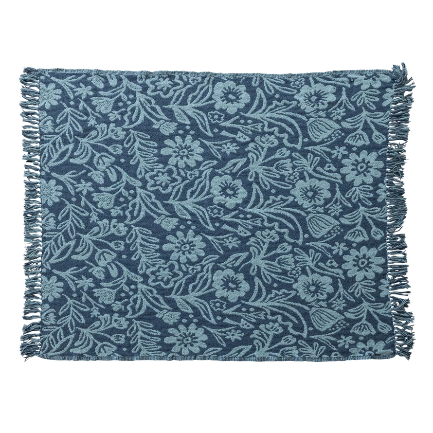 Catalog Name: 60"L x 50"W Woven Recycled Cotton Blend Jacquard Throw w/ Floral Pattern & Fringe, Blue & Light Blue