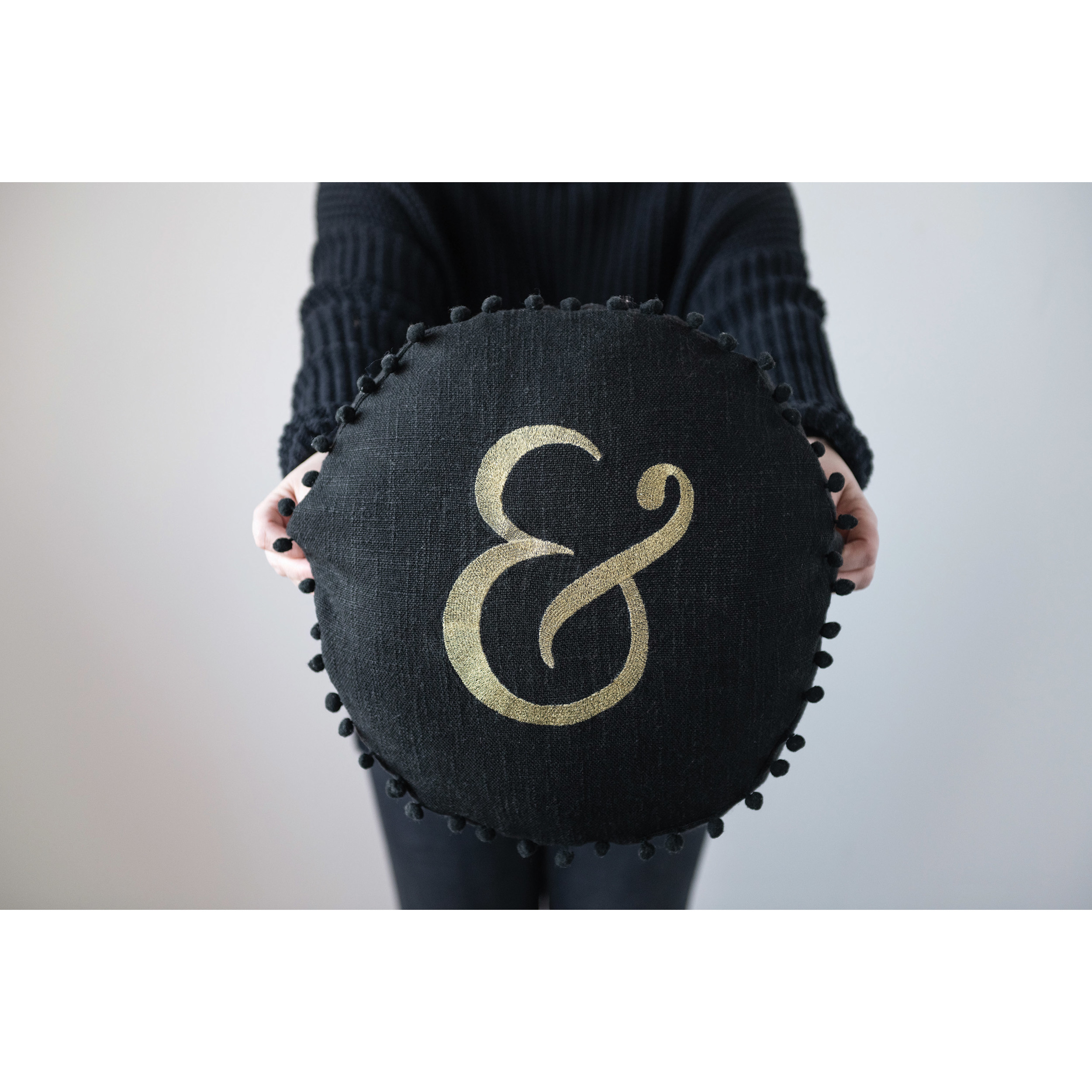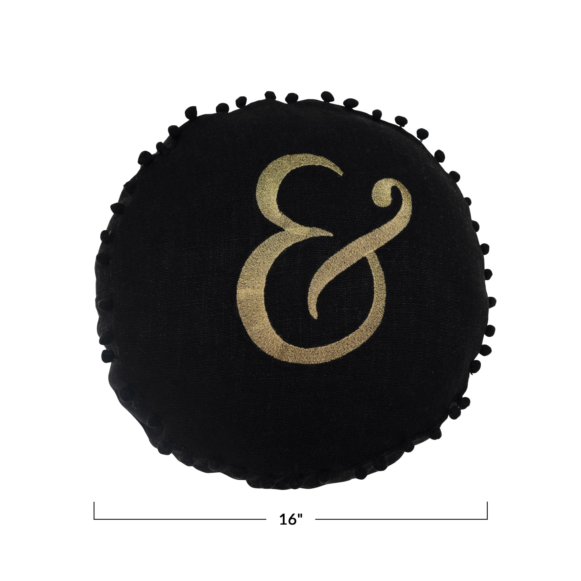 Catalog Name: 16" Round Fabric Embroidered Pillow w/ Pom Pom Trim "&", Black & Gold Color ©