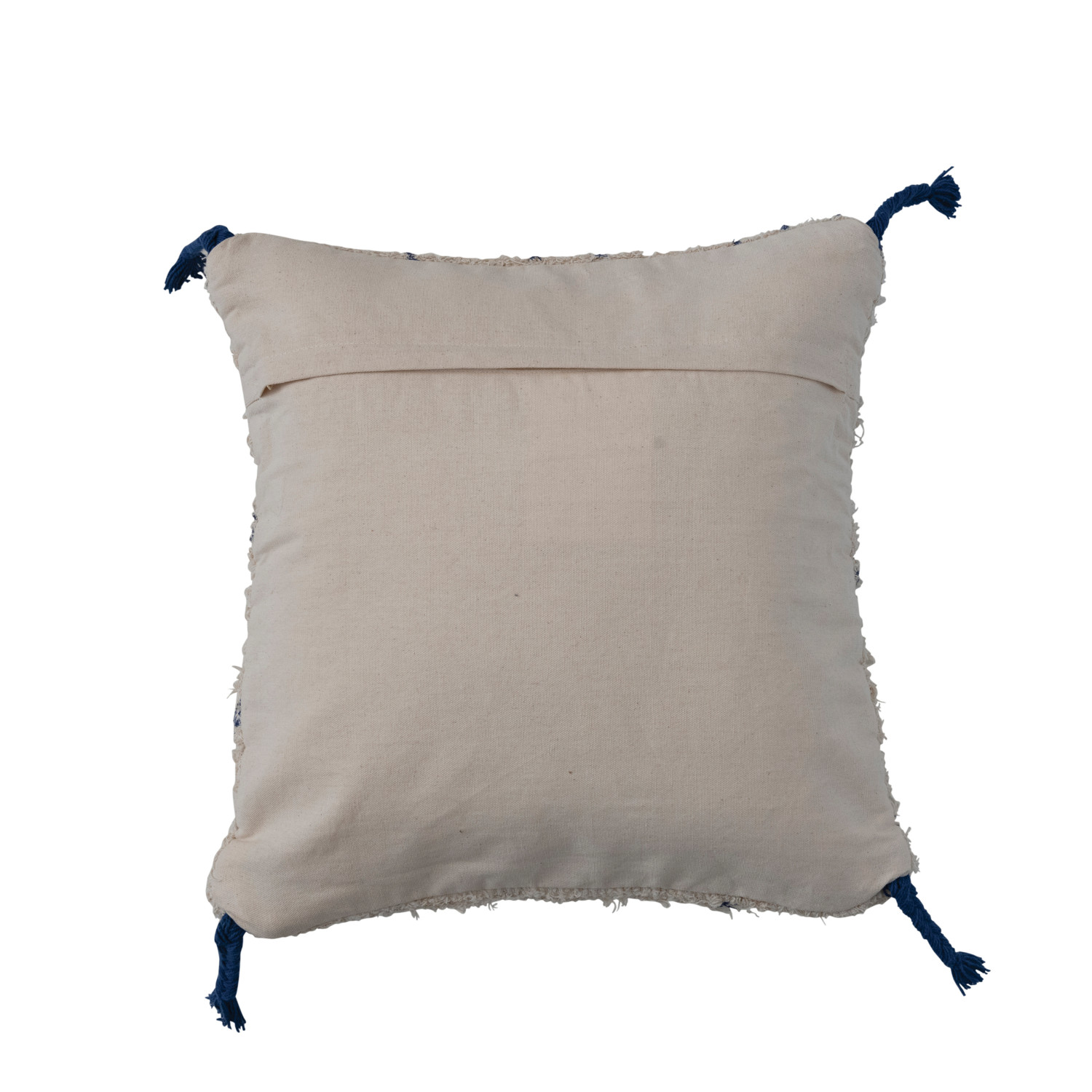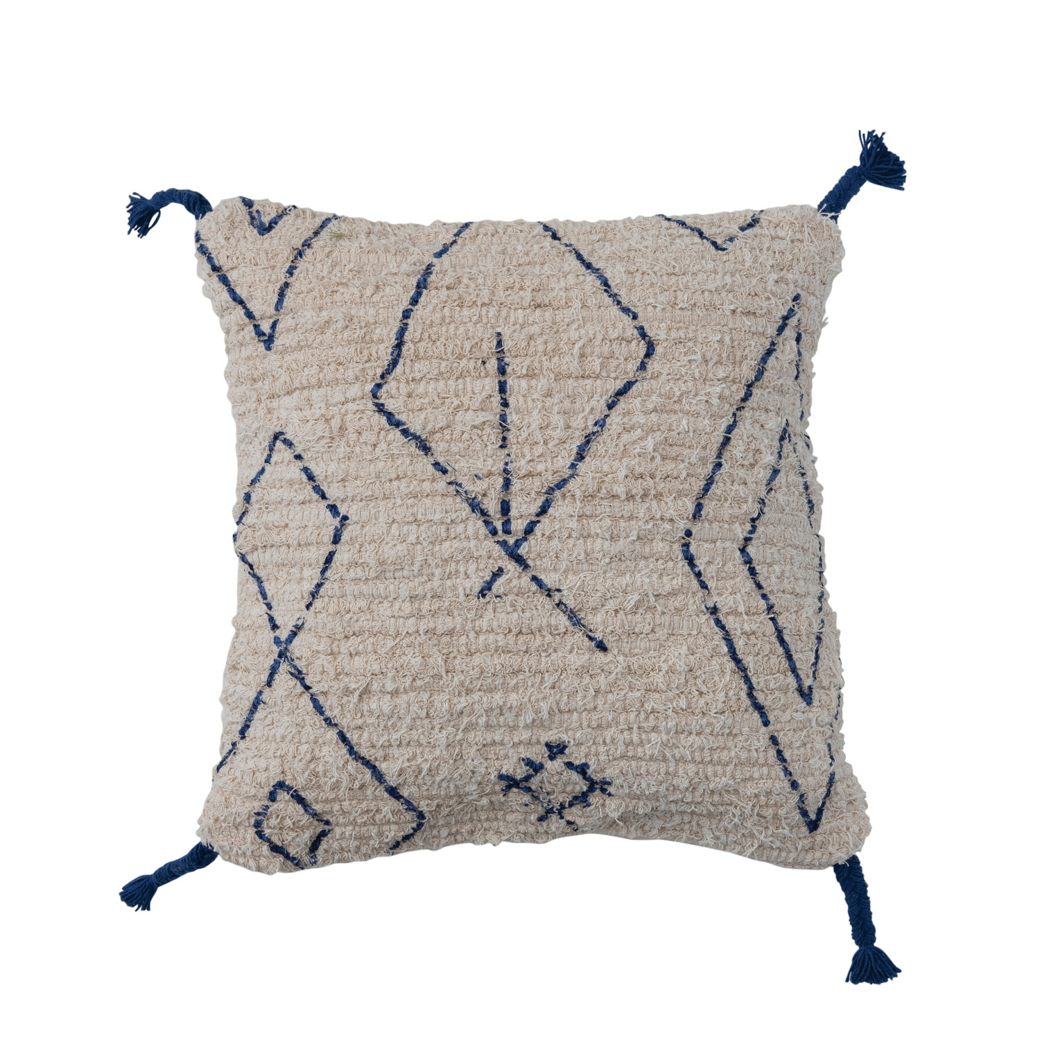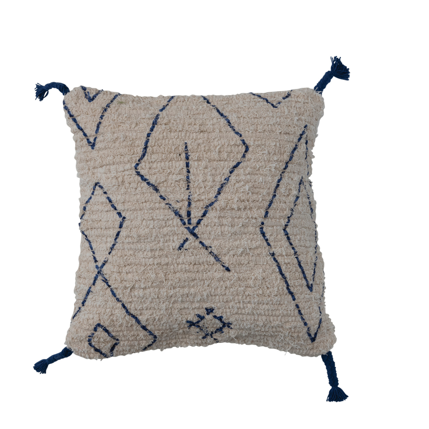 Catalog Name: 18" Square Cotton Tufted Pillow w/ Printed Moroccan Design & Braided Tassels, Natural & Blue