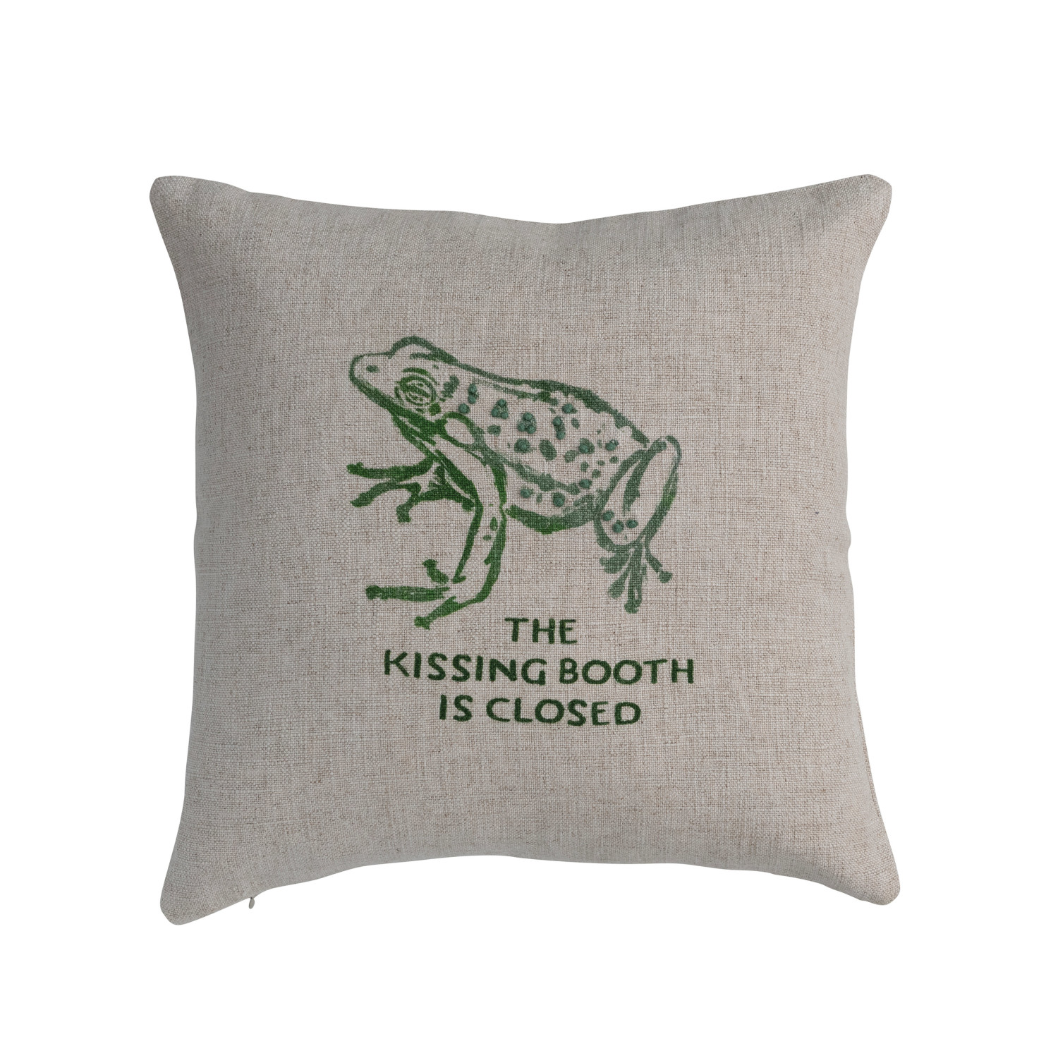 Add a whimsical touch to every home decor with the 16-inch Square Linen Blend Printed Pillow featuring an adorable frog and the playful text "The Kissing Booth is Closed", with Intricate French knots that add dimension and charm to the design. The pillow's linen blend fabric provides a soft and durable texture, while the natural and green color palette complements a variety of interior styles, and can be put on the couch, bed, or favorite chair for a delightful accent. This pillow features a rayon-linen blend cover that is comfortable and durable, and a 16-inch square shape that is versatile. This product is made of rayon and linen blend. This pillow measures 16 inches in length and 16 inches in width. Add a whimsical touch to every home decor with the 16-inch Square Linen Blend Printed Pillow featuring an adorable frog and the playful text "The Kissing Booth is Closed", with Intricate French knots that add dimension and charm to the design. The pillow's linen blend fabric provides a soft and durable texture, while the natural and green color palette complements a variety of interior styles, and can be put on the couch, bed, or favorite chair for a delightful accent. This pillow features a rayon-linen blend cover that is comfortable and durable, and a 16-inch square shape that is versatile. This product is made of rayon and linen blend.