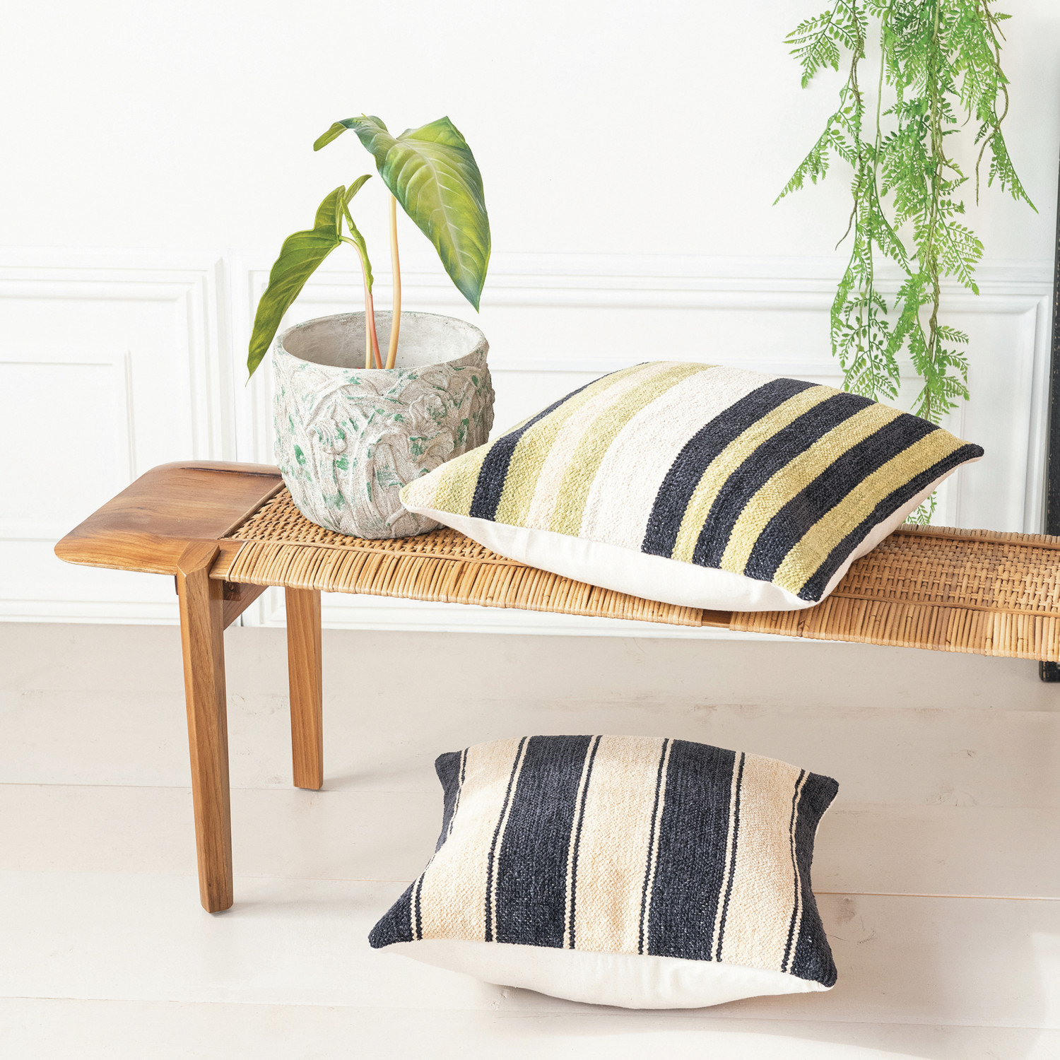 This Woven Cotton Blend Chenille Pillow captures the eye with its striking stripes in green, white, and cream. Crafted to complement industrial, farmhouse, or rustic styles, it serves as both a decorative piece and a source of comfort. The square shape is consistent with the classic design, while the materials—a blend of cotton and polyester—promise durability and easy maintenance. It measures 20.0 inches in length and 20.0 inches in width, providing a perfect square silhouette. With dimensions that provide ample support, this pillow is not just an item of decor but also a companion for relaxation.