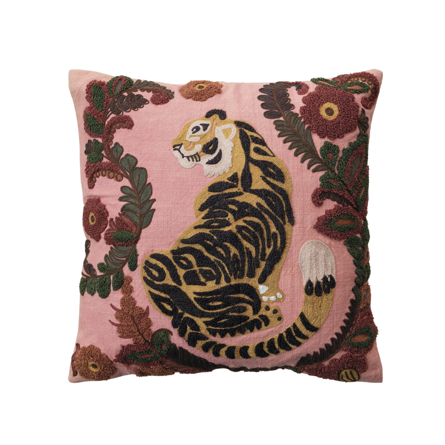 Catalog Name: 20" Square Cotton Slub Pillow w/ Embroidered Tiger & Flowers, Multi Color
