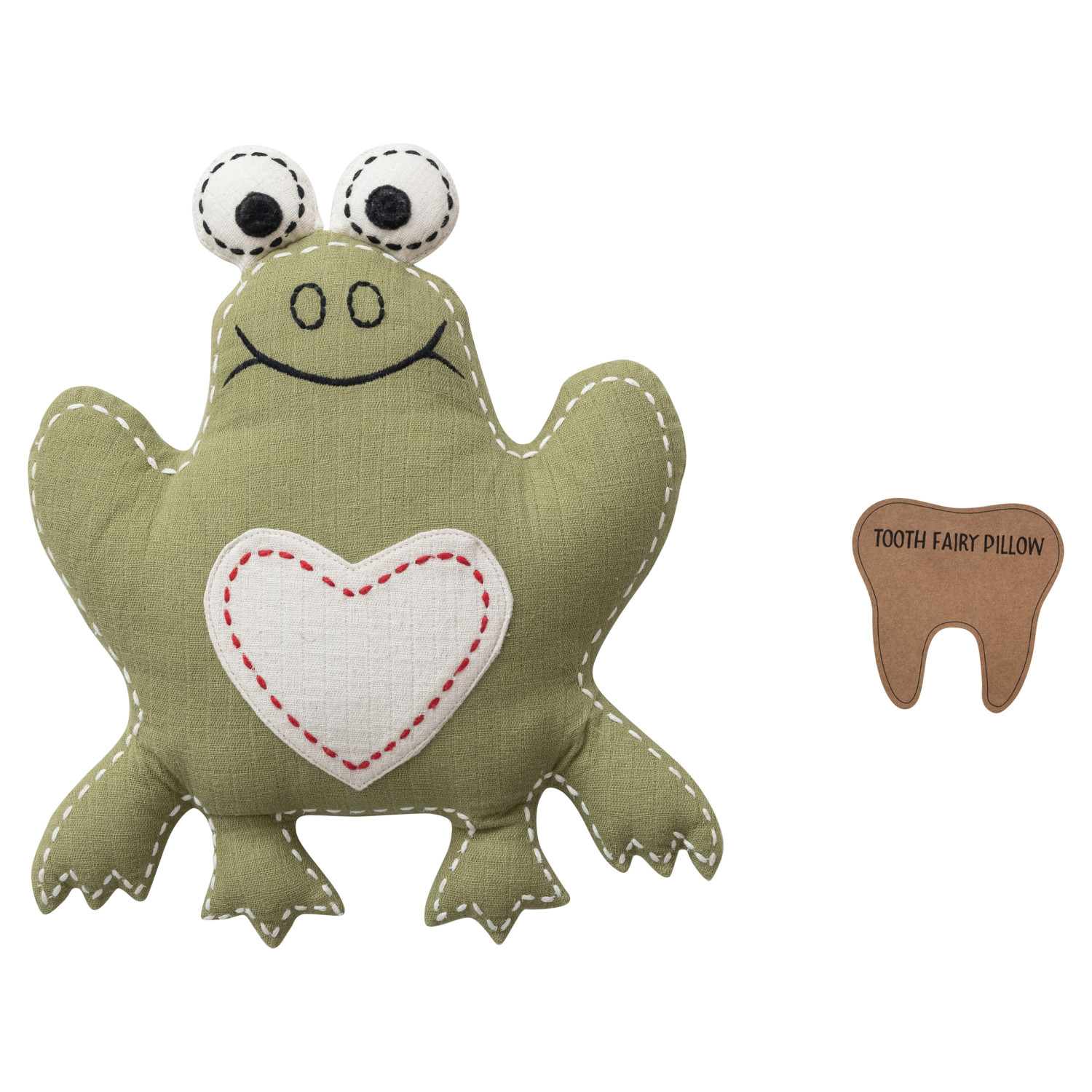 Catalog Name: 9-1/2"L x 2"W x 11-1/2"H Cotton Double Cloth Frog Tooth Fairy Pillow w/ Hand-Embroidery, Green & Natural