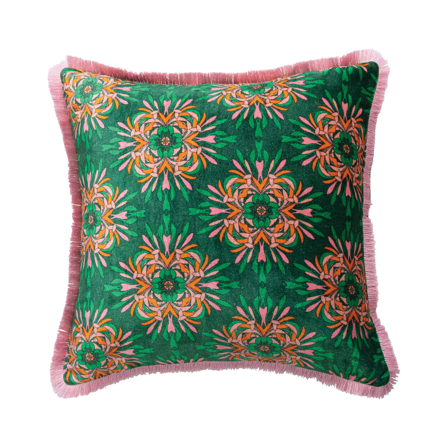 Catalog Name: 20" Square Velvet Printed Pillow w/ Floral Pattern & Eyelash Fringe, Green, Pink & Orange Color