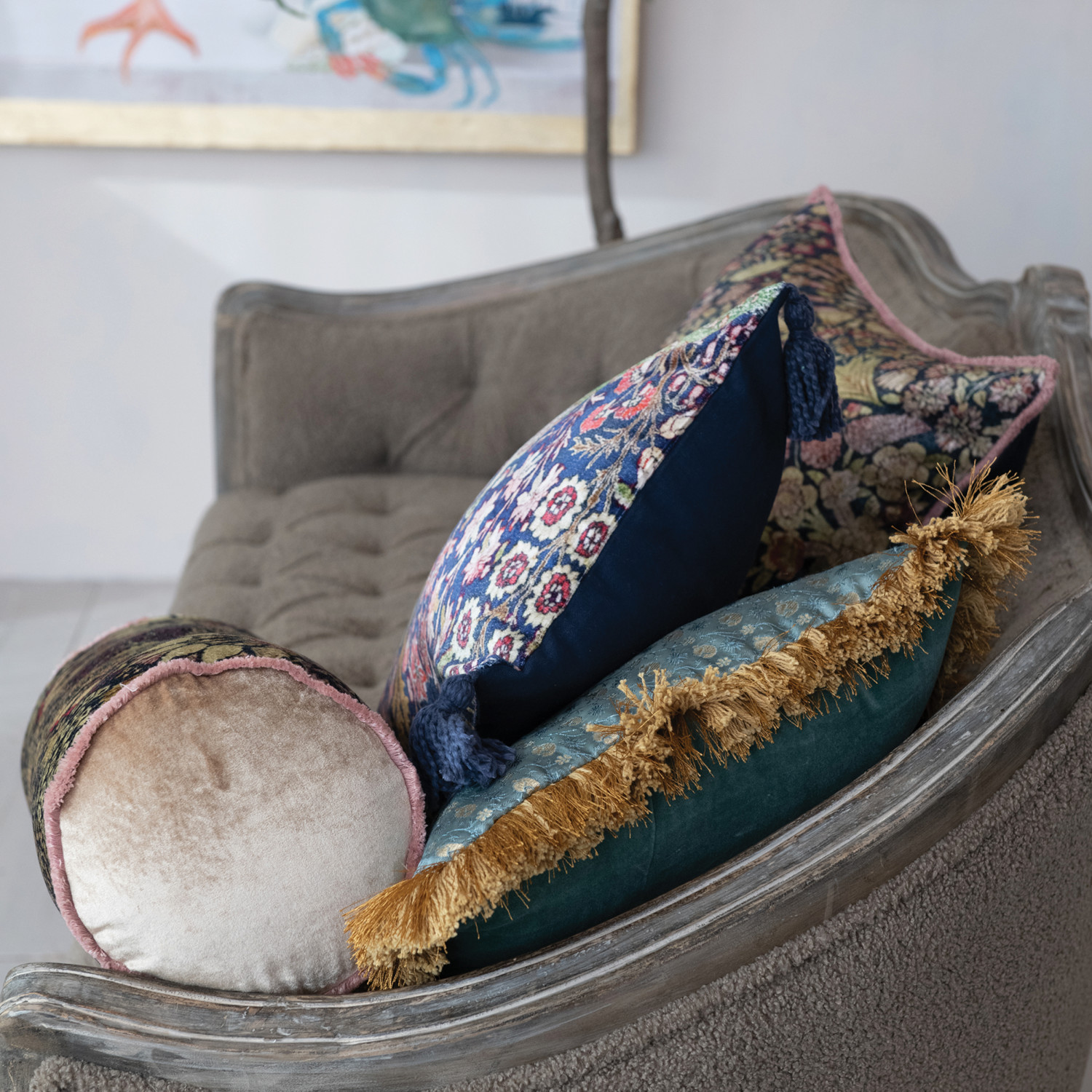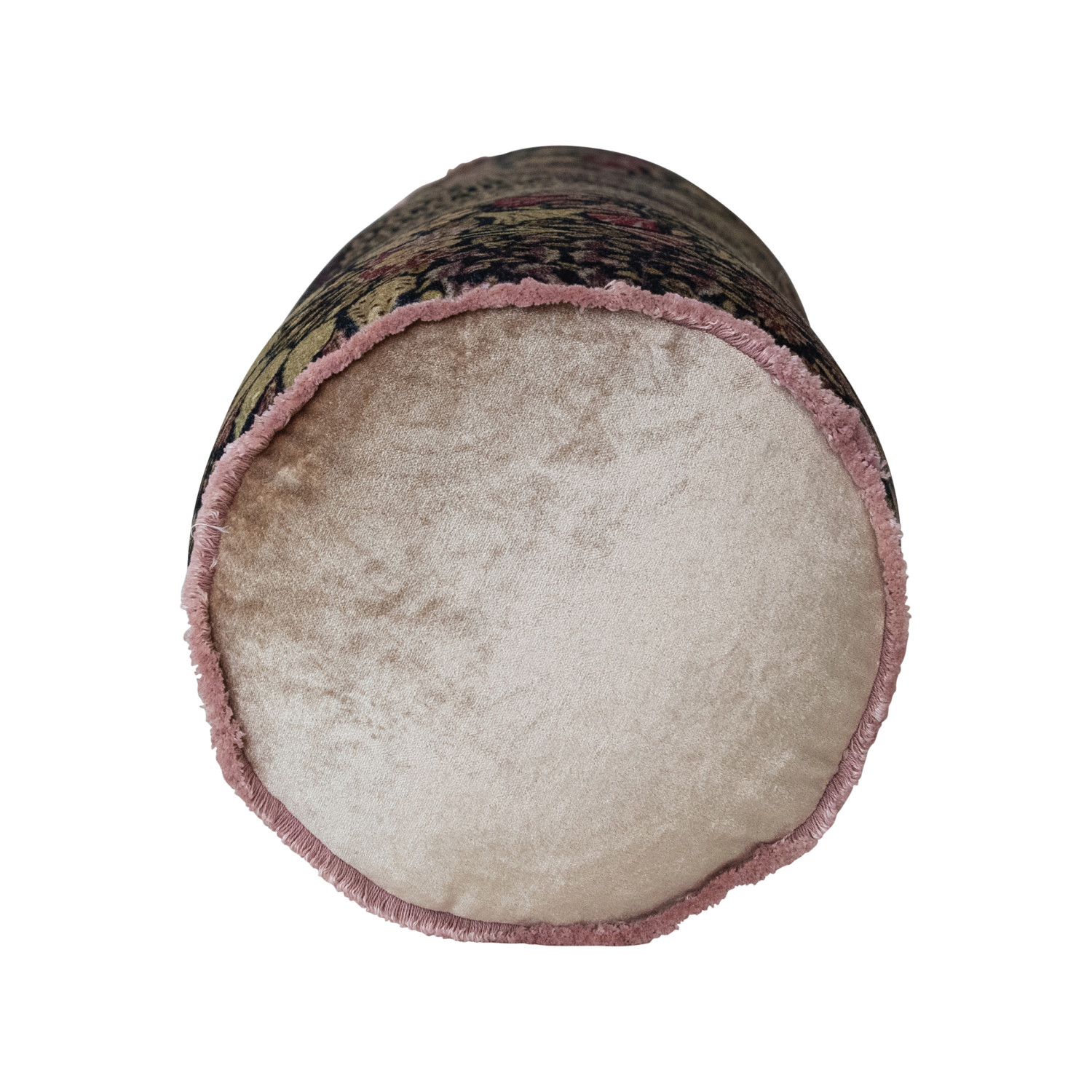 Cotton Velvet Printed Bolster Pillow w/ Botanical Pattern & Eyelash Fringe