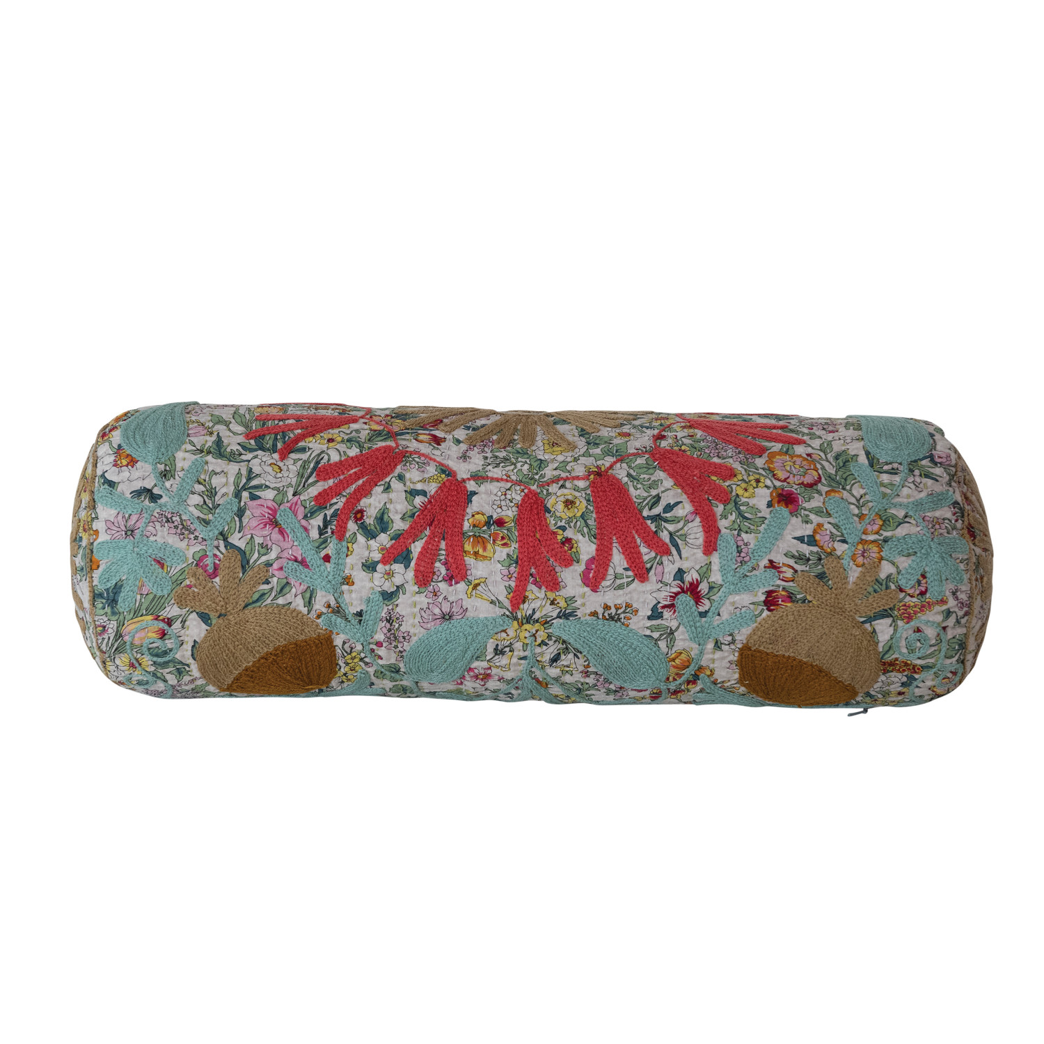 Catalog Name: 21"L x 7"H Stonewashed Cotton Voile Printed Bolster Pillow w/ Suzani Pattern & Hand-Embroidered Kantha Stitch, Multi Color