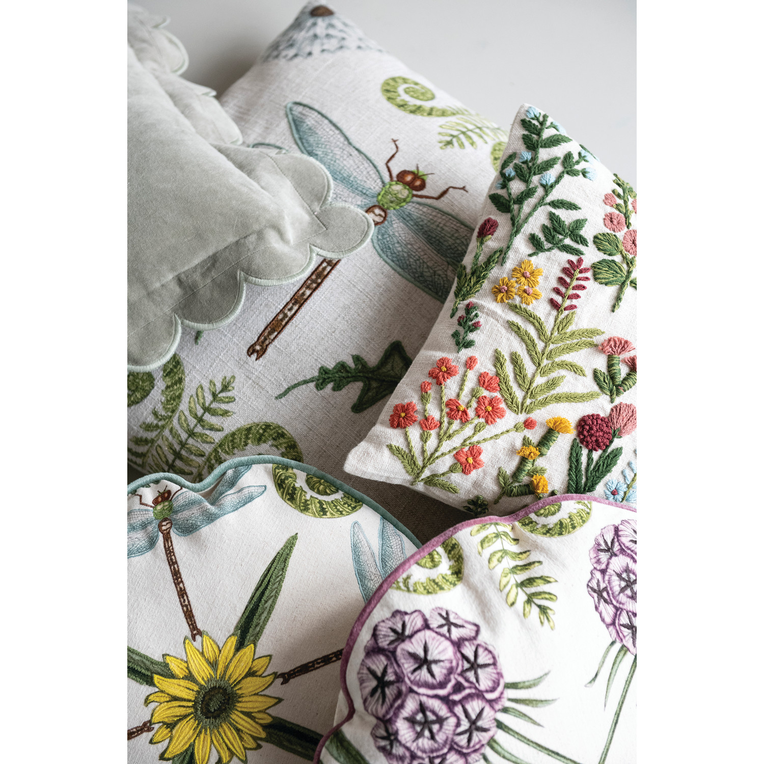 20" Square Linen Blend Pillow with Dragonfly, Botanicals & Embroidery ©