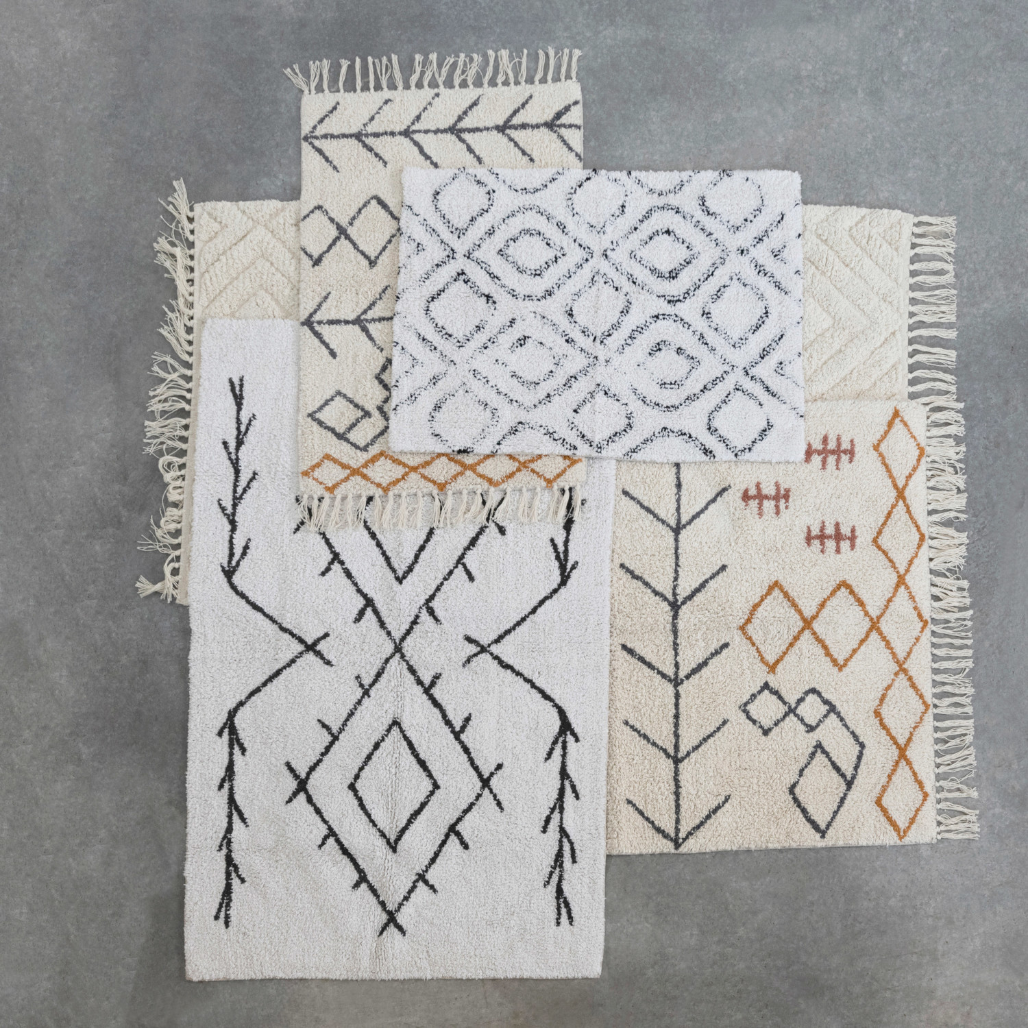 This modern boho rug showcases a geometric print on soft tufted cotton. Black and white tufted cotton geometric print rug. Spot Clean Only. 97% Cotton, 3% Other Fibers.