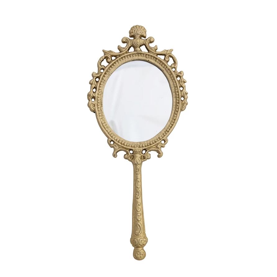 Embossed Metal Framed Hand Mirror, Antique Gold Finish