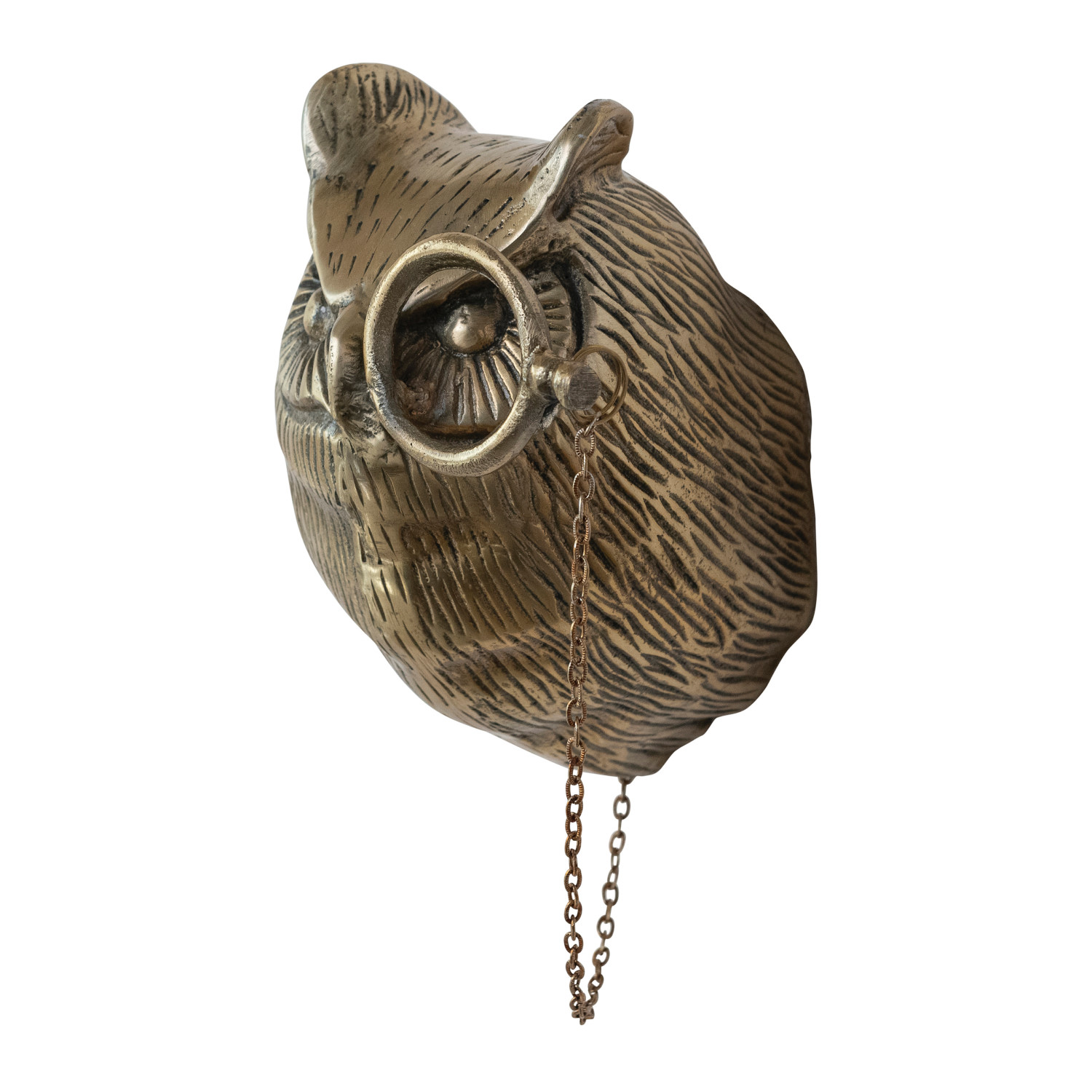 Cast Aluminum Owl Head with Monocle Wall Decor, Antique Brass Finish