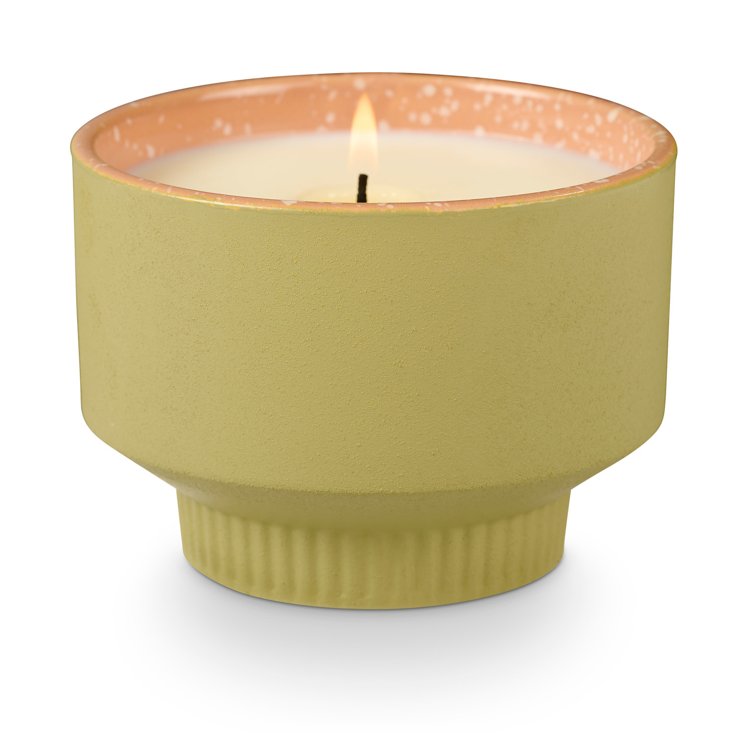 Inhale a fresh start inspired by the earthy green of the growing garden. Steeped in a Cali-cool vibe, these simple designs pair with a hint of retro throwback. Solid on the outside, speckled on the inside, this angular ceramic has a gentle taper and ribbed foot for a touch of texture. This scent features a fresh spritz of lemon-lime, rose, and soothing green tea. Plant-based soy blend candle poured in the USA. Thoughtfully designed from wax to wick, our candles add warmth and ambiance to any interior design scheme. Burns up to 25 hours; 1 wick.