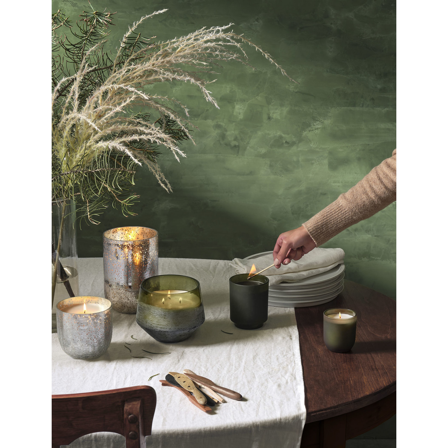 Bring on the shine -- it's time to celebrate with the seasonal fragrances of Noble Holiday, perfect for gifting and decorating the holiday home. Our large crackle glass candle comes packaged in an illustrated keepsake box, perfect for gift giving. This scent is grounded in rich oak moss with a heart of fir needle kissed with warm cinnamon. Plant-based soy blend candle poured in the USA. Burns up to 80 hours; 1 wick.