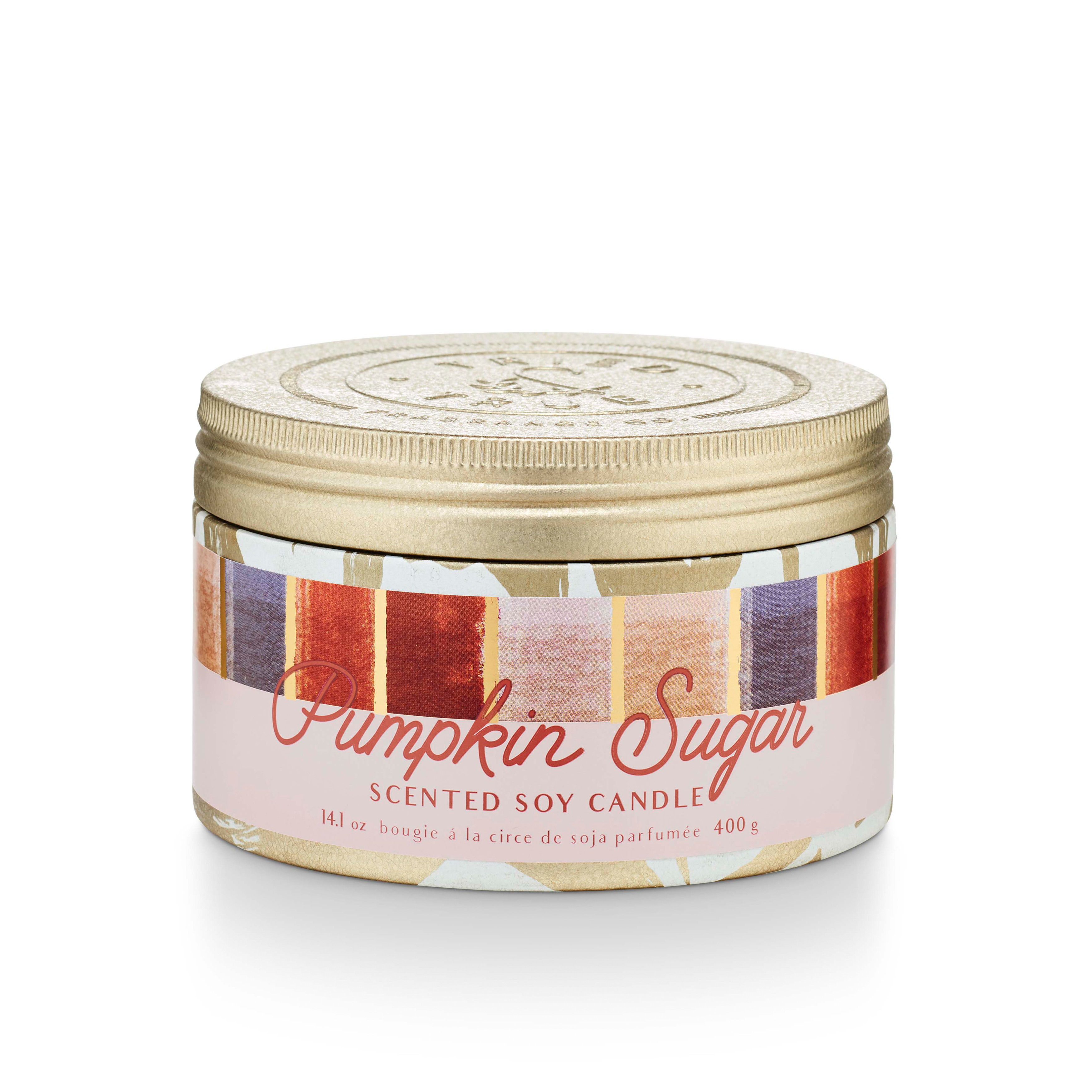 Fragrance Description: Notes of cinnamon, autumn pumpkin, and creamy vanilla. This scented 14.1 oz tin candle with lid makes a great gift. 30 hour burn time.