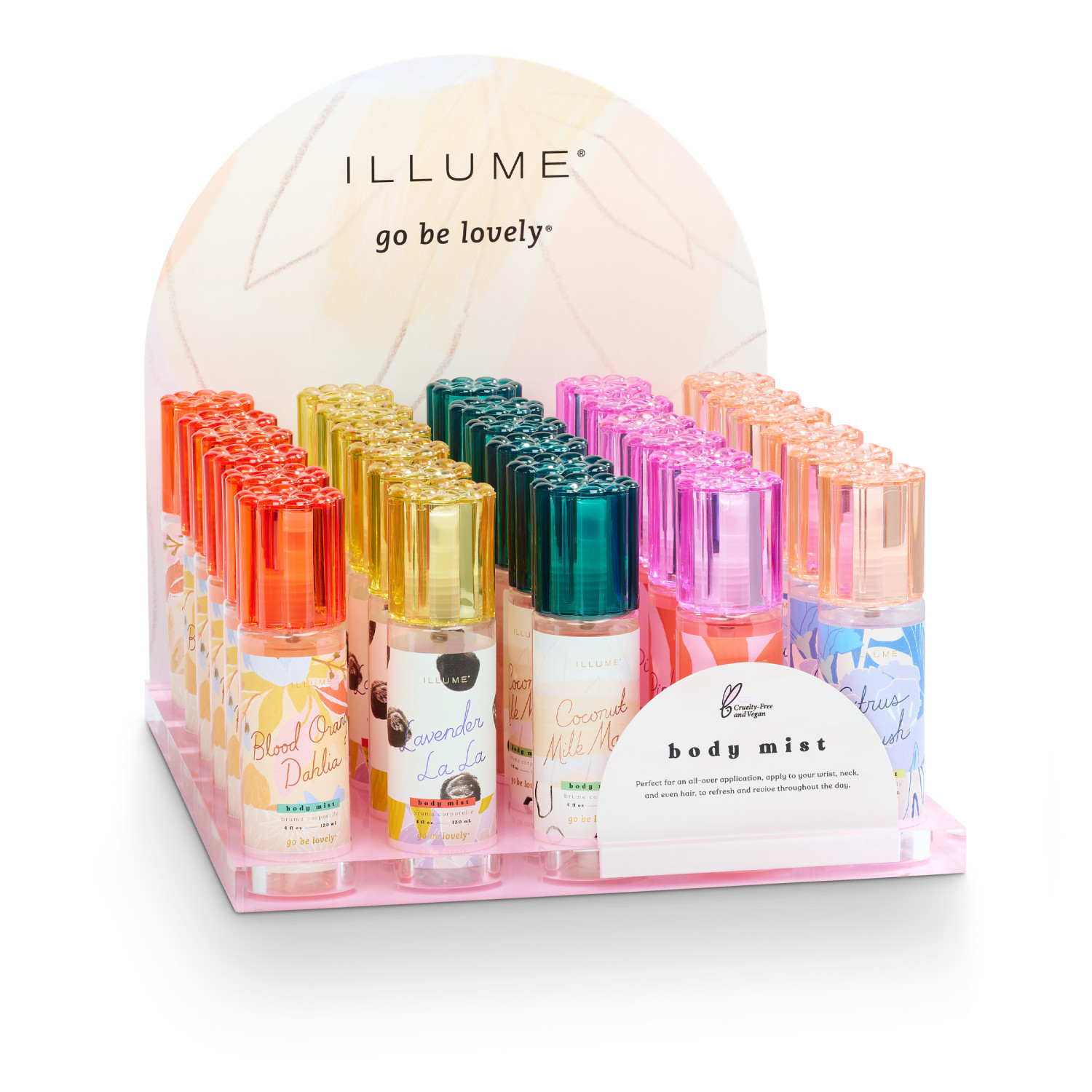 This stand-alone display for Go Be Lovely body mist products facilitates fragrance selection and impulse purchasing while complimenting any store's decor. Highly visible displays can increase featured products’ sales volume!